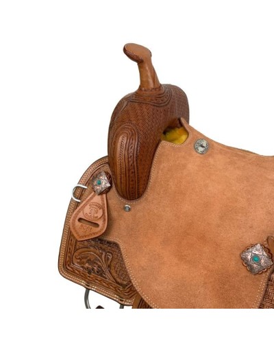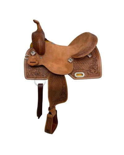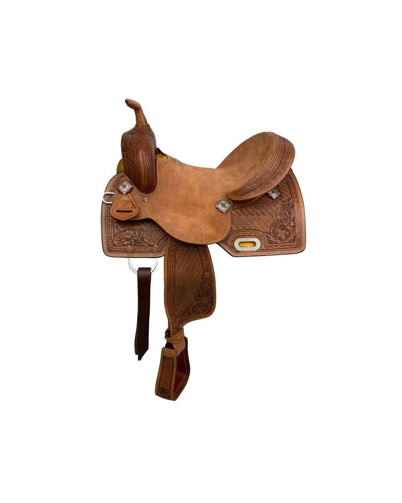 La selle Double T Daisy Drifter Barrel Style, avec une taille de siège de 16 pouces, est une pièce d'artisanat remarquable qui allie fonctionnalité et attrait esthétique, ce qui en fait un choix de premier ordre pour les coureurs de barrel et les amateurs d'équitation western. Cette selle présente un superbe motif d'outillage en bambou et floral qui entoure la selle, offrant un design unique et accrocheur. L'outillage complexe offre non seulement une beauté visuelle, mais également une adhérence texturée, améliorant la connexion du cavalier avec la selle.